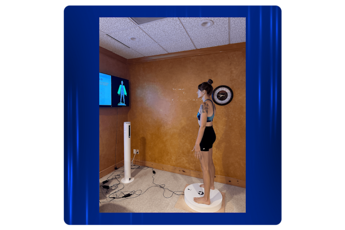 I’ve stripped down to my sports bra and short-shorts. My feet are planted on a circular stand that is not unlike a human-sized tabletop lazy Susan. I hold my hands awkwardly away from my sides as instructed, and the lazy Susan slowly starts to spin me around — and carefully measures every inch of me in the process. It’s all part of the body scan process, baby.